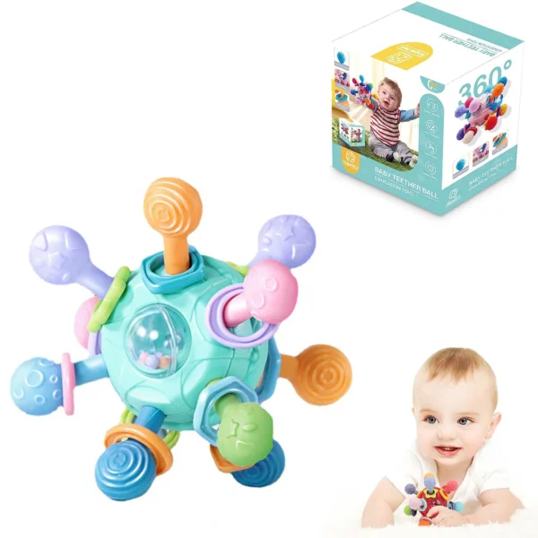 【Rattle & Ball Design】Teething toys are designed in a ball shape with 12 nibbling points to massage the teething bed to promote baby's sensory development and massage the gums to relieve teething pain.