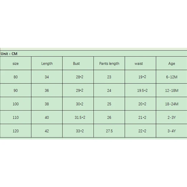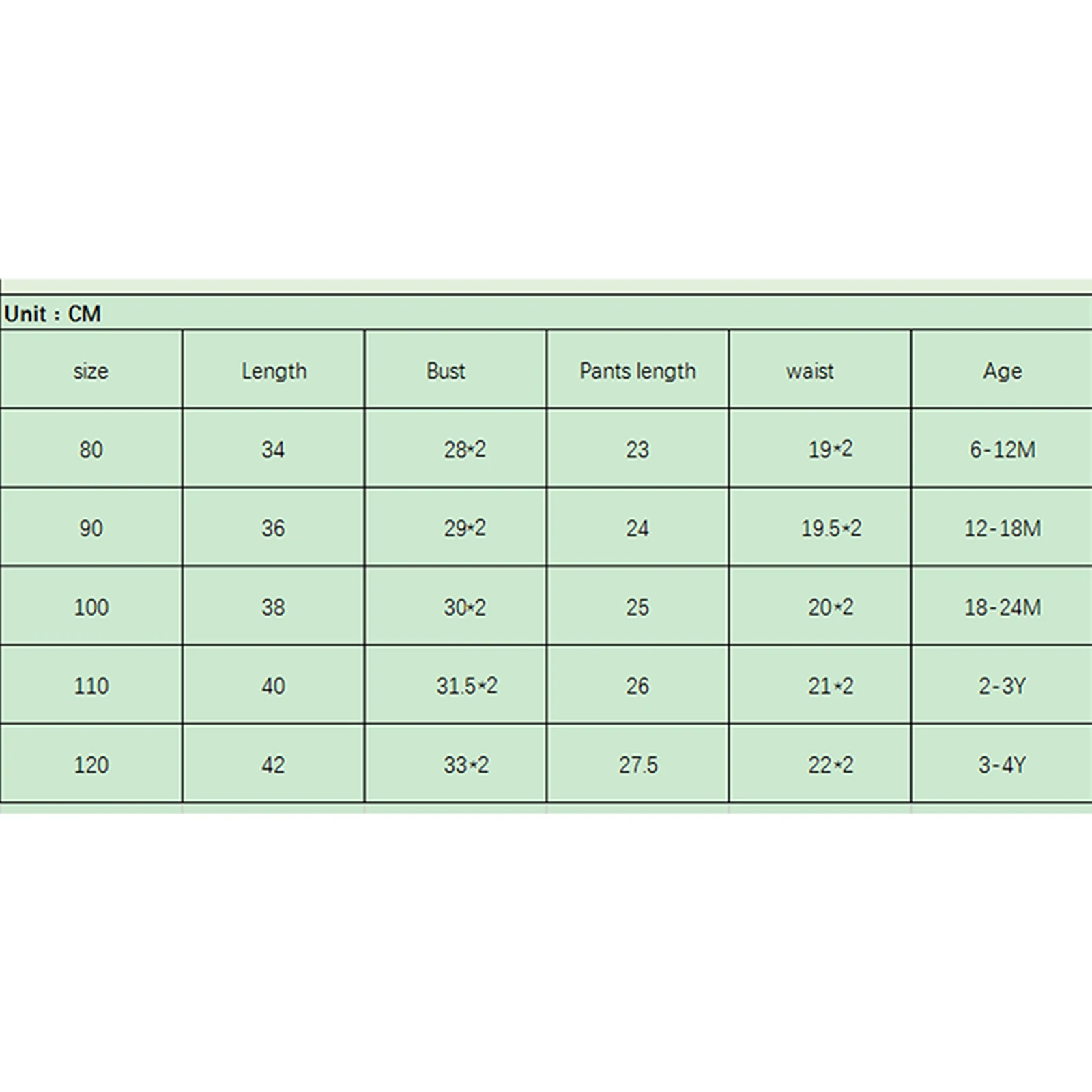 120 Tops Length: 16.54 Bust: 25.98 Pants Length: 10.83 Waist: 17.32 Advised Age: 3-4 Years